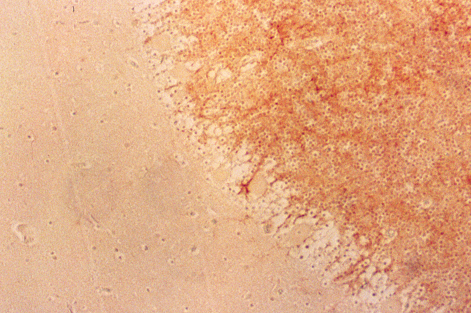 Materials and Methods Human brain tissues were obtained from 5 male individuals at autopsies carried out at Department of Legal Medicine, Shiga University of Medical Science. Tissue samples were fixed in 10% formalin and embedded in paraffin, and 3-micrometer sections were prepared for immunostaining and immunofluorescent labeling using antibodies to PGDS and Lewis x antigen. Rabbit polyclonal anti PGDS was produced in our department (12), and mouse monoclonal anti Lewis x antibody, Alexa Flour 488 (red) goat anti-mouse IgG and Alexa Flour 568 (green fluorescent) goat anti-rabbit IgG were purchased from DakoCytomation and Invitrogen, respectively. After treating with 0.3% H2O2 in methanol, the sections were incubated for overnight at 4 °C with anti-PGDS (diluted 1:1000) or anti Lewis antibodies (diluted 1: 100), for 2 hours at room temperature with biotinylated anti rabbit IgG and anti mouse IgG, respectively. All the immunochemicals used were diluted in phosphate buffered saline. The color was developed by immersing the section for 10 minutes with a mixture containing 0.02% diaminobenzidine (DAB), 0.0045% H2O2 in Tris-HCl buffer. The stained sections were mounted on glass slide and cover-slipped with Enteran. For the double immunofluorescent labeling, the sections were incubated with phosphate buffer containing anti Lewis x mouse monoclonal antibody and anti-PGDS rabbit polyclonal antibody for overnight at 4 °C. After washing off the primary antibodies, they were incubated with fluorescence labeled anti-mouse IgG and anti rabbit IgG for 2 hours at room temperature. Fluorescence was observed under confocal laser-scanning microscope (LSM510 Carl Zeiss).