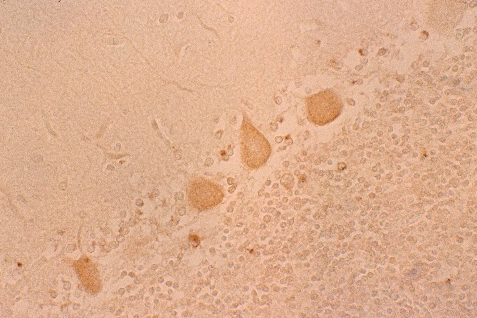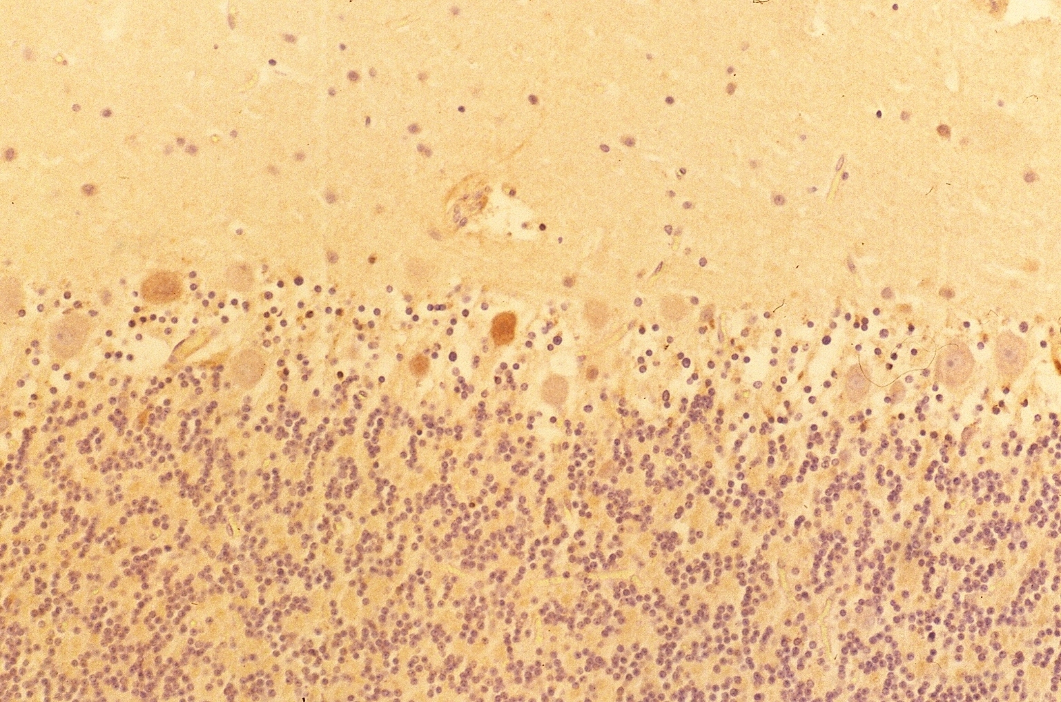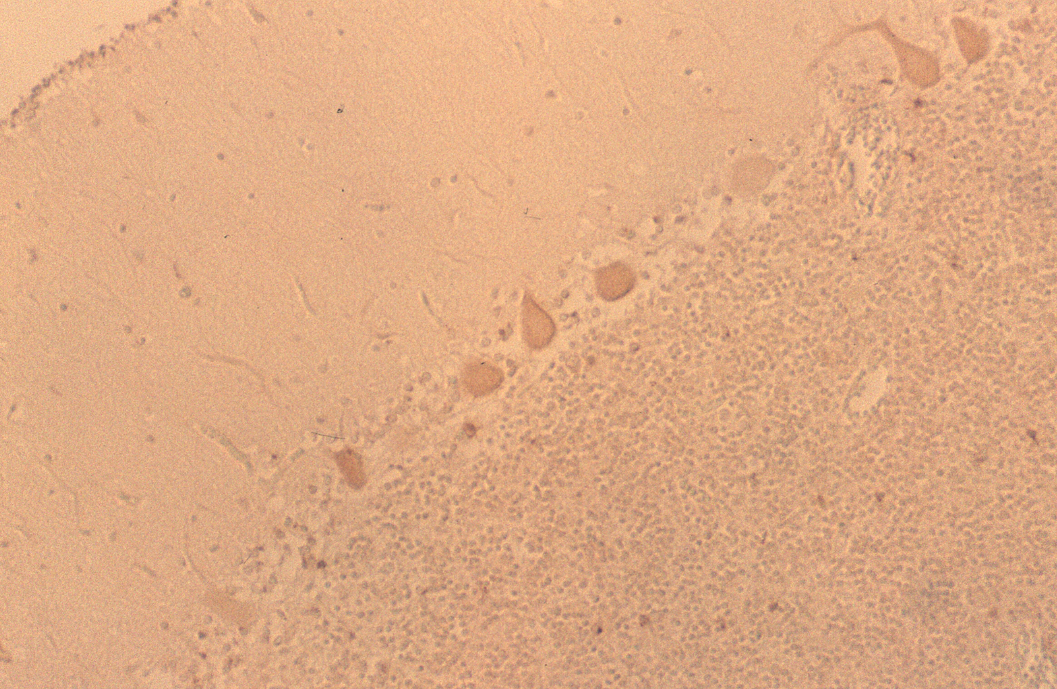 The reactive site with anti-PGDS antibody in the Purkinje cells, neurons in the dentate nucleus and nuclei in the medulla oblongata was localized in the cytosol and dendrite of the cells. No reactivity was observed in nuclei and membrane of these cells.