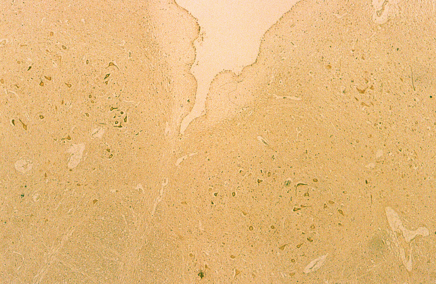 Results Antibody specificity Anti-Lewis x antibody stained clearly the granule cells in the blood vessels and showed intensive reactivity with the dendrites of granular cell layer in the cerebellum, microglia and astrocyte cells in the cerebellum and medulla oblongata. The results obtained by anti Lewis x were shown in Fig. 1. However, no reactivity was observed in the Purkinje cells and the neurons in the granular cell layer, the nucleus dentate of the cerebellum and the neurons in the nuclei of the medulla oblongata. There was no reactivity observed in these tissue sections by anti-sialyl-Lewis x antibody (10). On the other hand, anti-PGDS antibody stained the Purkinje cells and neurons of the nucleus dentate in the cerebellum and neurons in the nuclei of the medulla oblongata. Fig.1 Immunostaining (DAB) of anti-Lewis x antibody in human cerebellum and medulla oblongata.